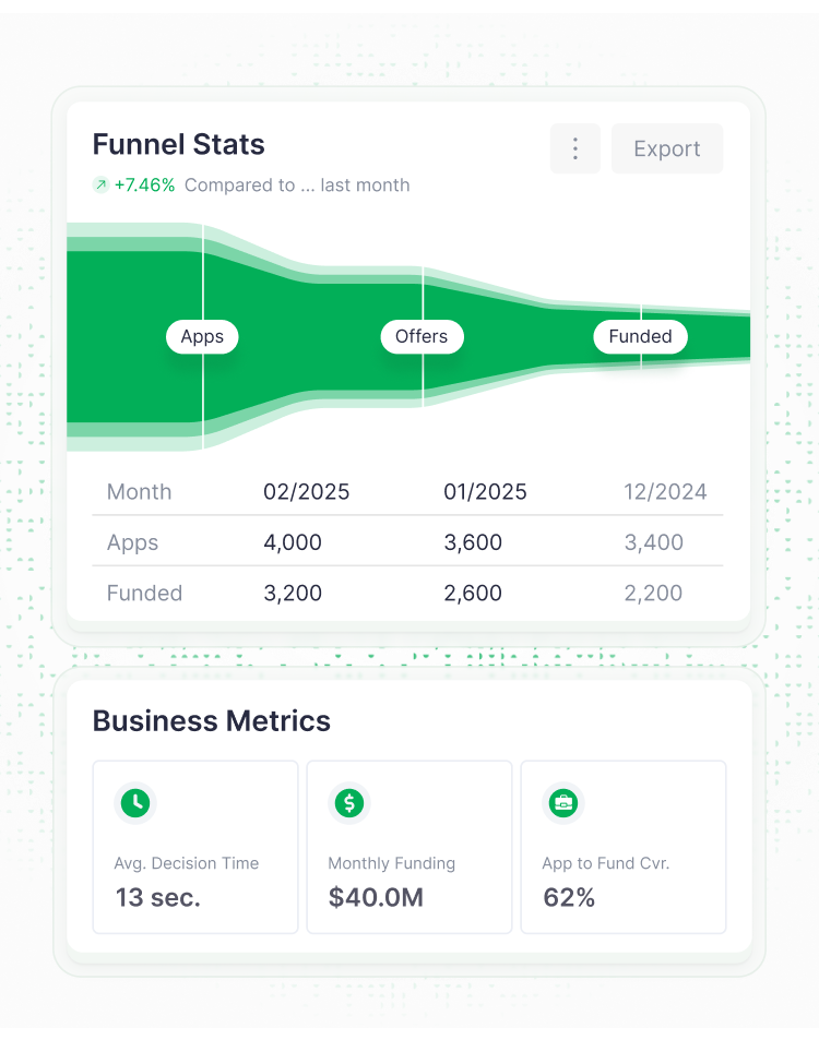Applications received, pre-quals issued, offers accepted, funded deals, average time-to-decision, and drop-off points—each filterable by date range, partner, or product.